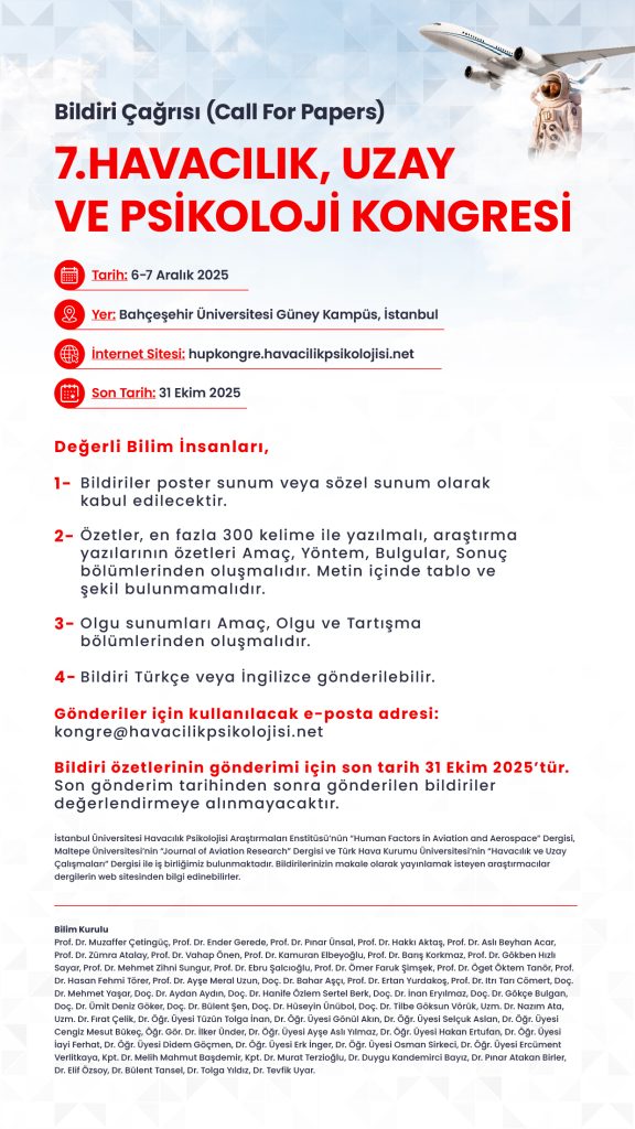 İstanbul Üniversitesi Havacılık Psikolojisi Araştırmaları Enstitüsü’nün “Human Factors in Aviation and Aerospace” Dergisi, Maltepe Üniversitesi’nin “Journal of Aviation Research” Dergisi ve Türk Hava Kurumu Üniversitesi’nin “Havacılık ve Uzay Çalışmaları” Dergisi ile iş birliğimiz bulunmaktadır. Bildirilerini makale olarak yayınlamak isteyen araştırmacılar dergilerin web sitesinden bilgi edinebilirler.
